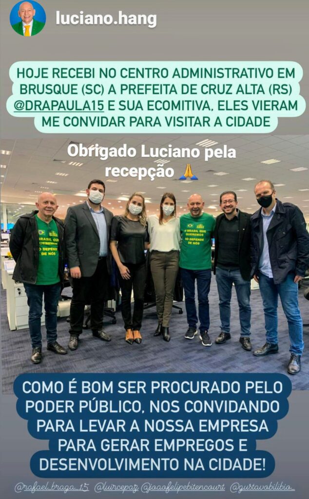 “Havan – Estamos determinados a tornar Cruz Alta uma cidade com melhor qualidade de vida. Precisamos de investimentos em nossa cidade e empregos para nossa gente. Cruz Alta tem pressa! Obrigado Luciano pelo convite de vir a Brusque, e pela excelente recepção
