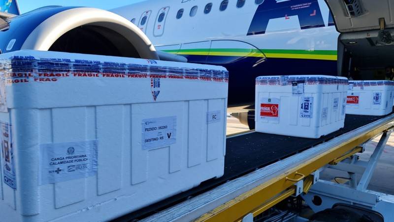 Também chegaram ao RS no início da tarde desta terça-feira, no mesmo voo da remessa de Coronavac, mais 269.100 doses de Astrazeneca, que serão reservadas, por recomendação do Ministério da Saúde, para aplicação de D2.