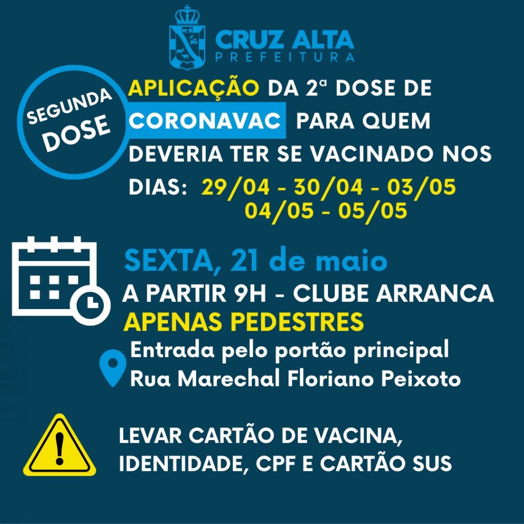 Lembrando que a imunização é destinada a quem deveria ter recebido a segunda dose da CoronaVac nos dias 29 e 30 de abril e 03, 04 e 05 de maio.