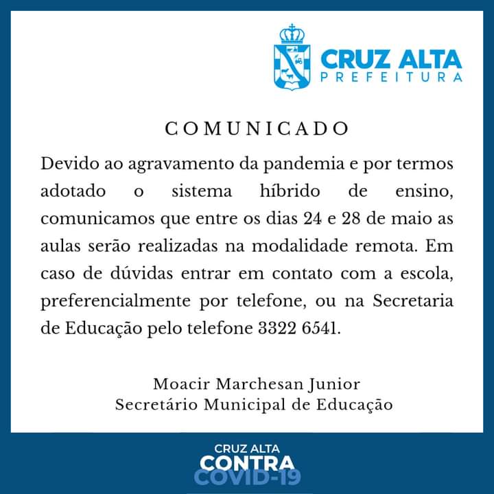 Rede Municipal suspende aulas presenciais devido ao aumento de casos de Covid-19 De 24 a 28 de maio as aulas da Rede Municipal de Ensino serão remotas. Confira o comunicado publicado na noite deste sábado 22 de maio após decisão do Secretário Municipal de Educação Júnior Marchesan. Confira o comunicado: