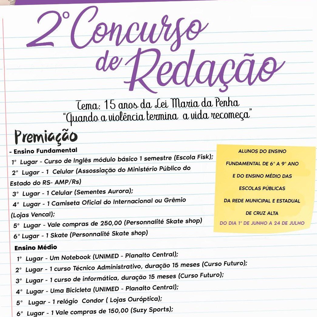 O concurso é direcionado aos alunos da rede municipal e estadual de Cruz Alta que poderão concorrer em duas categorias: ensino fundamental para quem está cursando do 6° ao 9° ano e alunos do ensino médio.