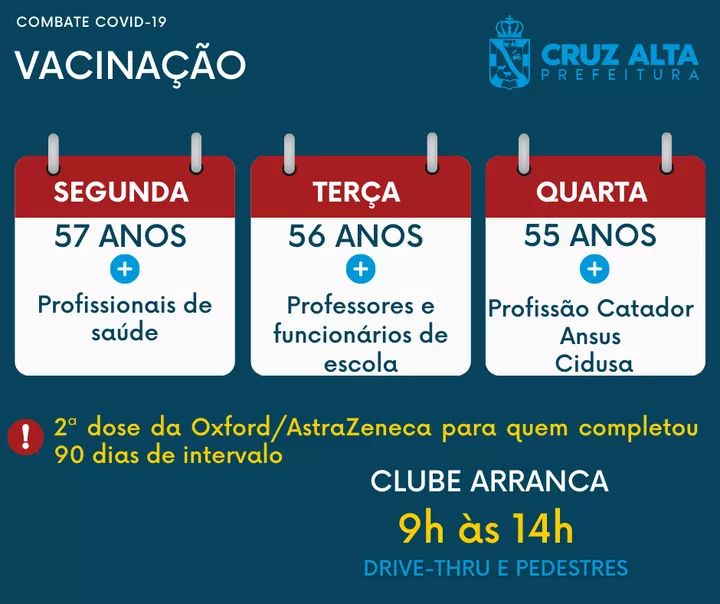 Cruz Alta irá receber um novo lote da Oxford/AstraZeneca para dar continuidade a imunização por faixa etária e alguns grupos prioritários.