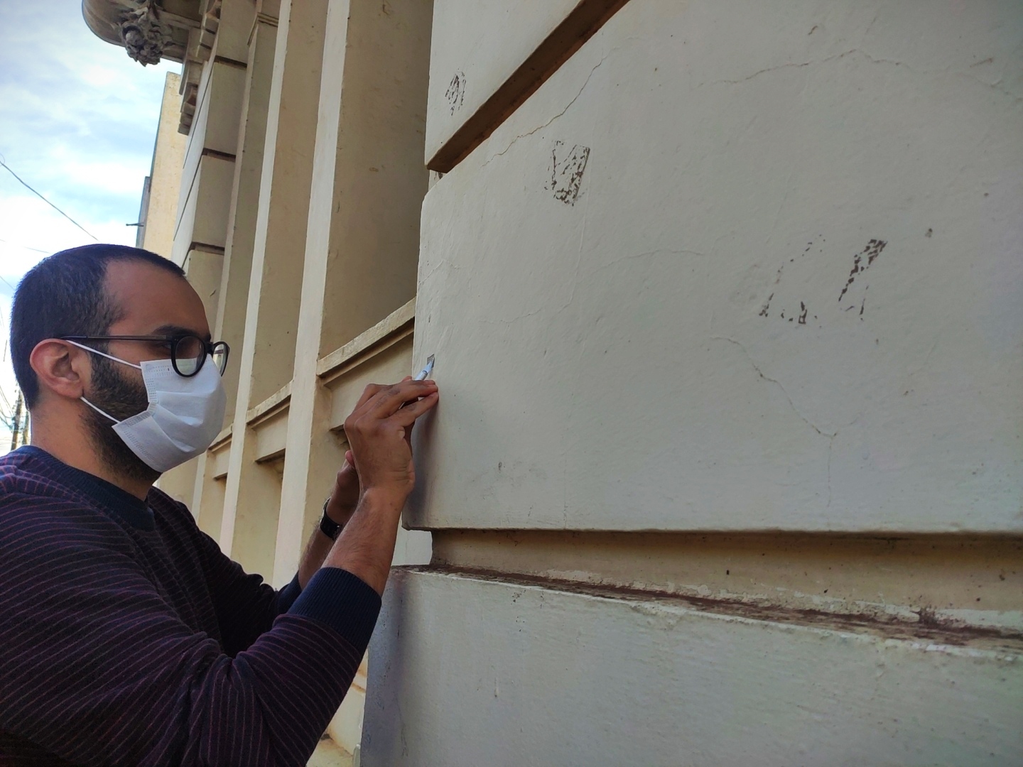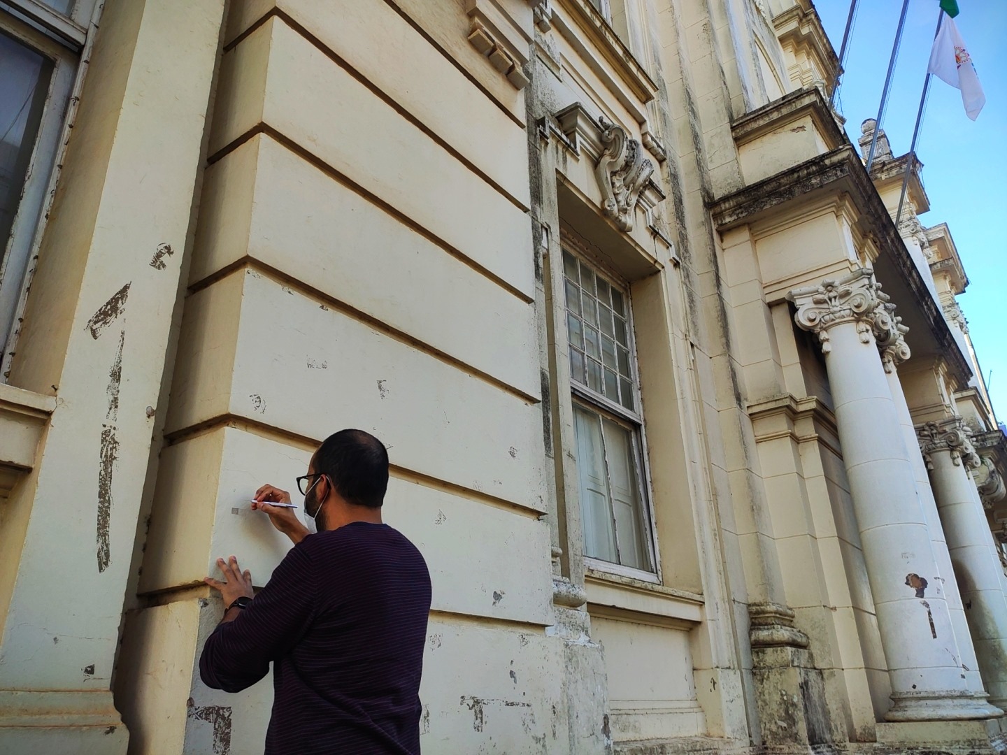 O arquiteto e urbanista do município, Mateus Veronese, iniciou o trabalho de avaliação das camadas de pintura do prédio da Intendência. “Eu estou fazendo o que a gente chama de prospecção, tirando as camadas de tinta, para a gente fazer o levantamento das cores existentes antes, para documentar e encaminhar para o IPHAE”.