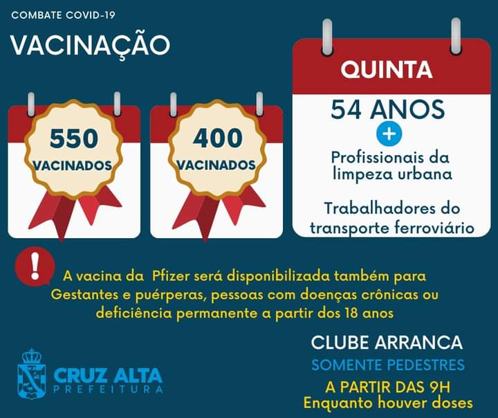 Nesta quarta-feira foram vacinadas 440 pessoas, de segunda-feira até hoje 1500 no total, A Prefeitura de Cruz Alta recebeu hoje da secretaria estadual de saúde mais 768 Doses da vacina da Pfizer enviadas pelo Governo Federal, e Aguarda a chegada de mais 1280 doses da vacina da Janssen anunciada pelo governo estadual mas que ainda não foram entregues.