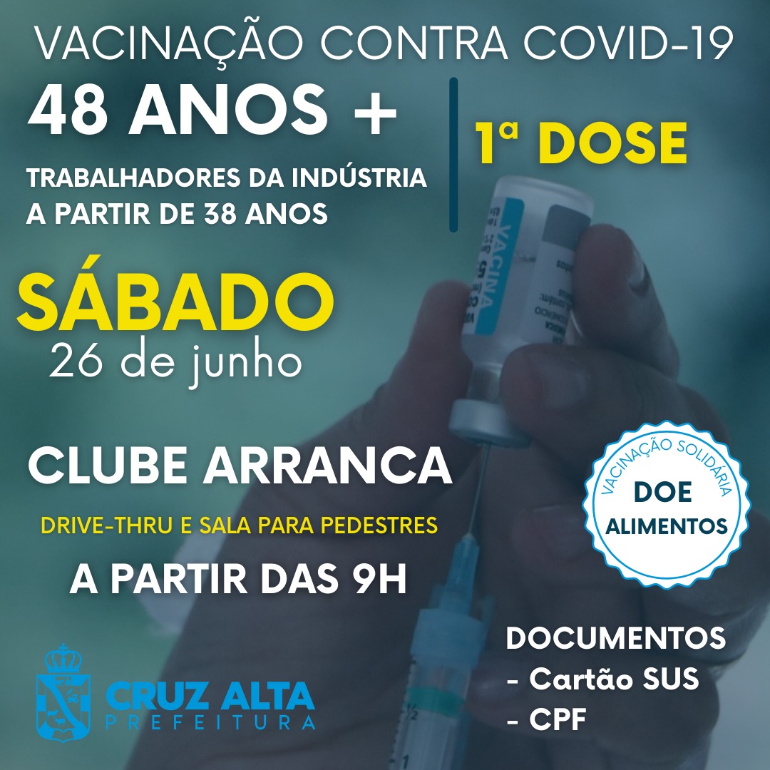 Vai ter drive-thru e sala para pedestres. Em caso de chuva o drive será interrompido e as doses serão aplicadas apenas no Salão do Clube Arranca.