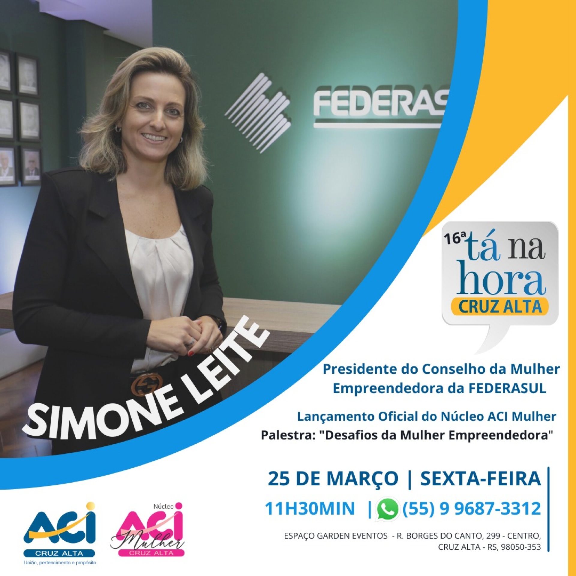 A 16ª edição do “Tá na Hora Cruz Alta” está programada para o mês de março. O evento já consolidado pela ACI Cruz Alta, traz como palestrante Simone Leite, presidente do Conselho da Mulher Empreendedora da Federasul e ex-presidente da Federasul.