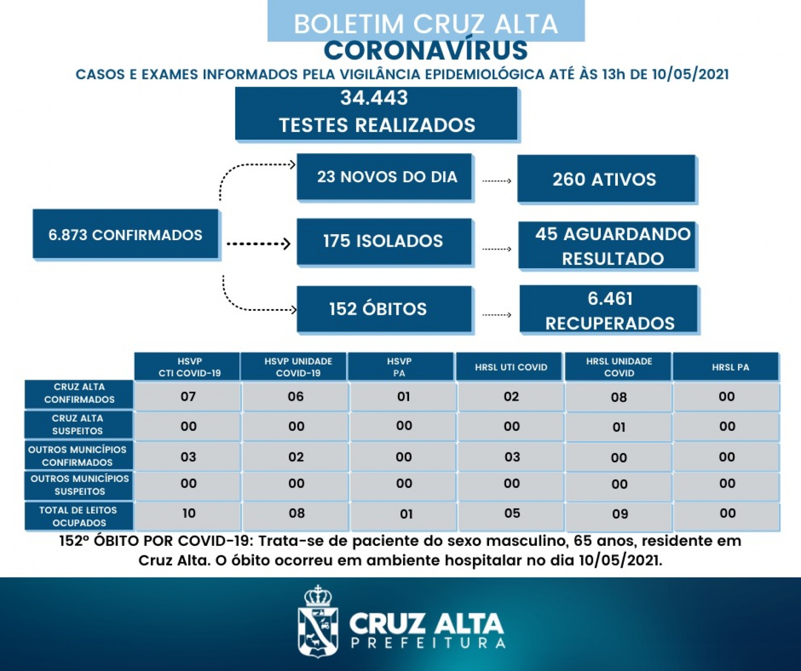 O Boletim epidemiológico divulgado nesta segunda feira traz os dados atualizados da Covid-19 em Cruz Alta, desde o inicio da pandemia já foram realizados 34.343 testes, e Hoje Cruz Alta possui 6461 pacientes recuperados e 152 óbitos desde março de 2020. Confira abaixo os números: Confira os números atualizados: 23 novos casos 260 casos ativos 175 pessoas em isolamento domiciliar …